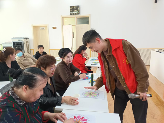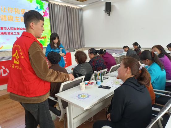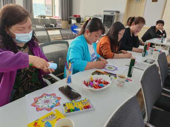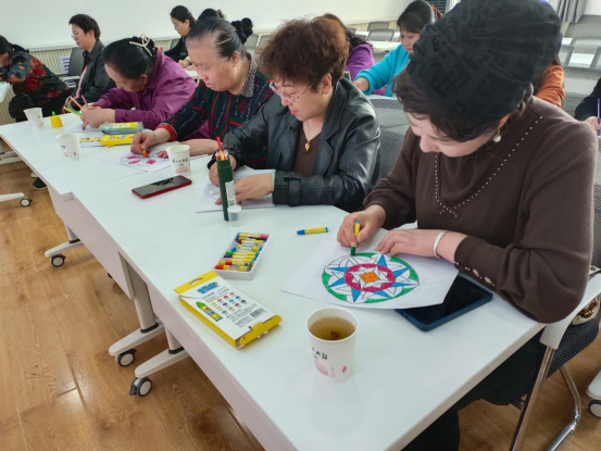 接着,在一段优美的音乐中冥想缓解压力。由城南街道社工站工作人员给辖区内妇女群众分发曼陀罗绘画纸,让她们在画纸上涂上自己喜欢的颜色,并在涂色过程中由城南社工站主讲师唐泽逐一进行分析。绘画结束后又由城南社工站主讲师唐泽讲解曼陀罗绘画的意义和象征。