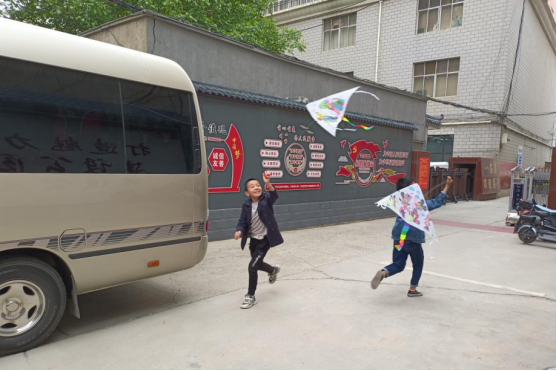 试飞时,孩子们在院内兴奋地奔跑,一只只承载着孩子们梦想的风筝,随着孩子们的快乐自由的飞翔,构成一幅美丽的风筝放飞画卷。