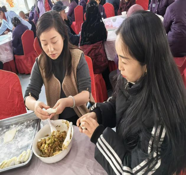 民俗体验环节堪称活动高潮,包饺子现场热闹非凡。工作人员提前备齐新鲜饺子皮、多样馅料及相关工具,长者们踊跃参与、分工协作,擀皮、填馅、捏合,动作娴熟流畅。大家围坐在一起,唠家常、忆往昔、话团圆,一张张饱满圆润的饺子在欢声笑语中成型,既包裹着鲜香的馅料,更承载着邻里情、节日暖,将冬至团圆的寓意诠释得淋漓尽致。