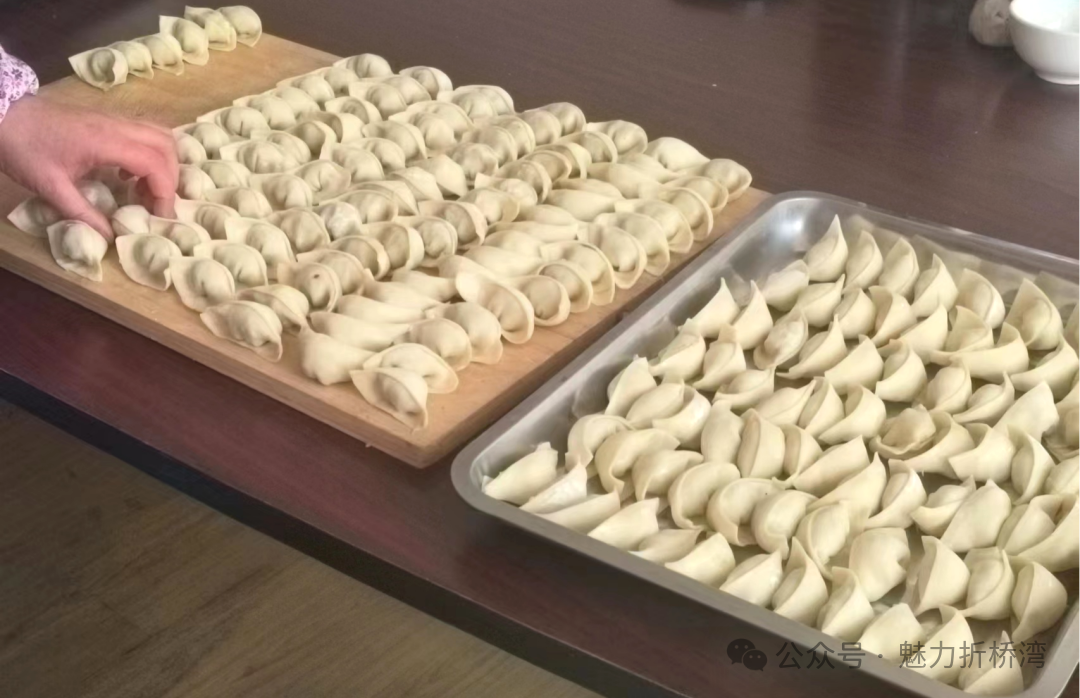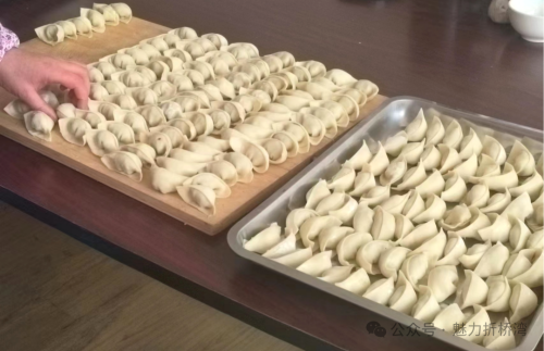 随后,大家一起准备饺子馅,有的和面,有的包馅,大家开心的围在一起,相互传授包饺子的经验,人多力量大,不一会饺子就摆满了盘子。