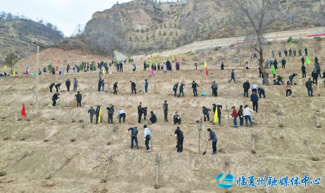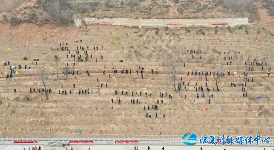 临夏市环城北路沙子坡段面山绿化现场,彩旗飘扬、人头攒动,一派热火朝天的劳动景象。郭鹤立等州领导一到绿化点就与干部群众一起投入到植树活动中。大家挥锹挖坑、扶直苗木、培土围堰、平整踩实、提水浇灌,经过大家辛勤劳动,一株株苗木横竖成行,迎风挺立,在暖阳的普照下焕发出一派勃勃生机,为河州大地增添了一抹新绿。