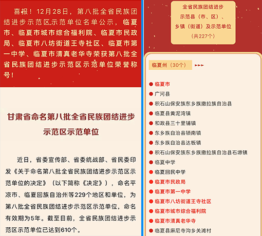 在打造铸牢中华民族共同体意识和我国宗教中国化示范区的过程中,临夏市先后荣膺“全国(全省)民族团结进步示范市”,中共临夏市委、临夏市人民政府被国务院表彰为“全国民族团结进步模范集体”,临夏市青少年校外活动中心被国家民委命名为全国民族团结进步创建活动教育基地,临夏市民政局、临夏市城市综合福利院、清真老华寺等29个单位荣获全省民族团结进步示范单位荣誉称号,临夏市城管局、西关街道、临夏市第三幼儿园等109个单位荣获州级民族团结进步先进集体荣誉称号。硕果累累的示范创建活动,谱写了一曲曲新时代各民族共同团结奋斗、共同繁荣发展的美丽篇章。
