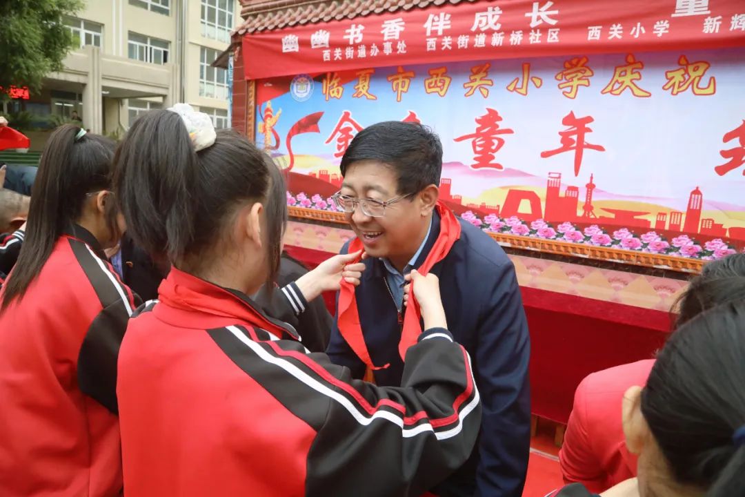在西关小学,少先队员们为刘尚增一行佩戴鲜艳的红领巾,“小朋友们节日快乐!”刘尚增向孩子们送上节日祝福,为孩子们颁发奖状和礼品,并希望广大教育工作者用心、用情、用力做好青少年教育路上的启明星,引导他们逐梦星辰大海、点亮心中梦想,做对祖国建设有用的人才。