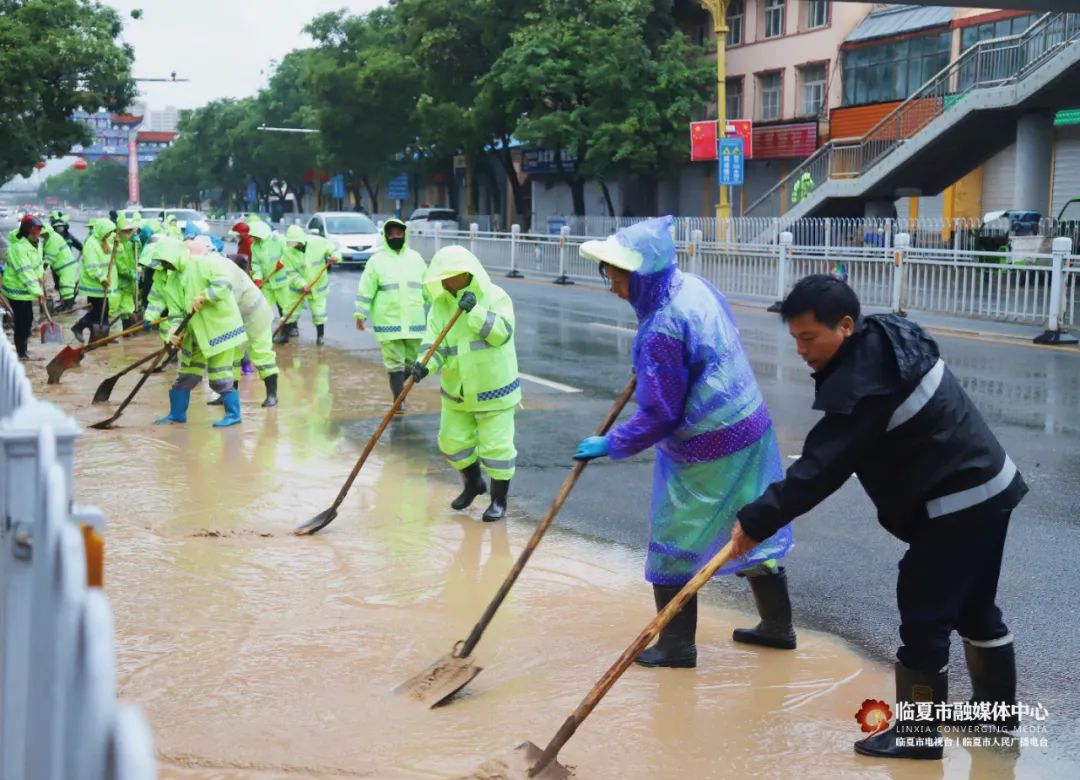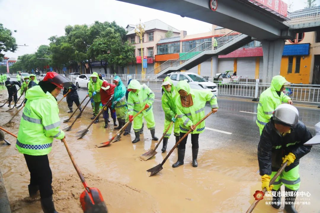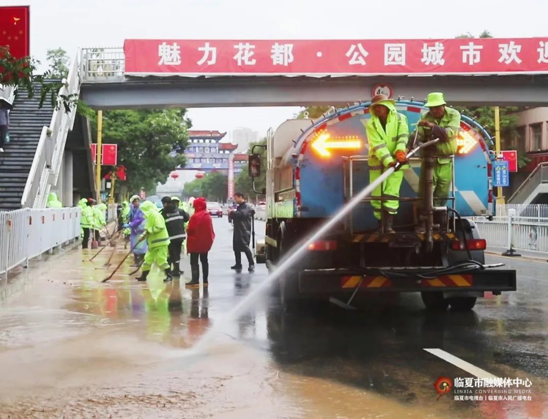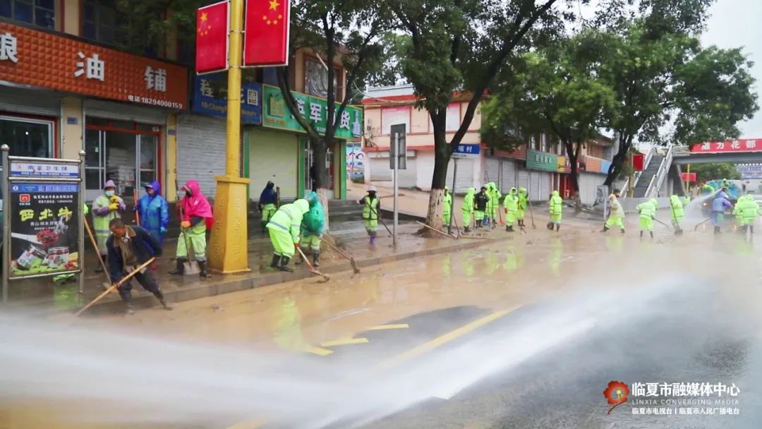 在临夏市迎宾大道路段,记者看到,城管队员及环卫工人们正身着雨衣雨鞋,手持铁锹、扫帚等工具,对道路上的淤泥、杂物进行清理,随后,利用高压冲洗车、洒水车、洗扫车对路面进行全方位细致冲洗和洗扫。