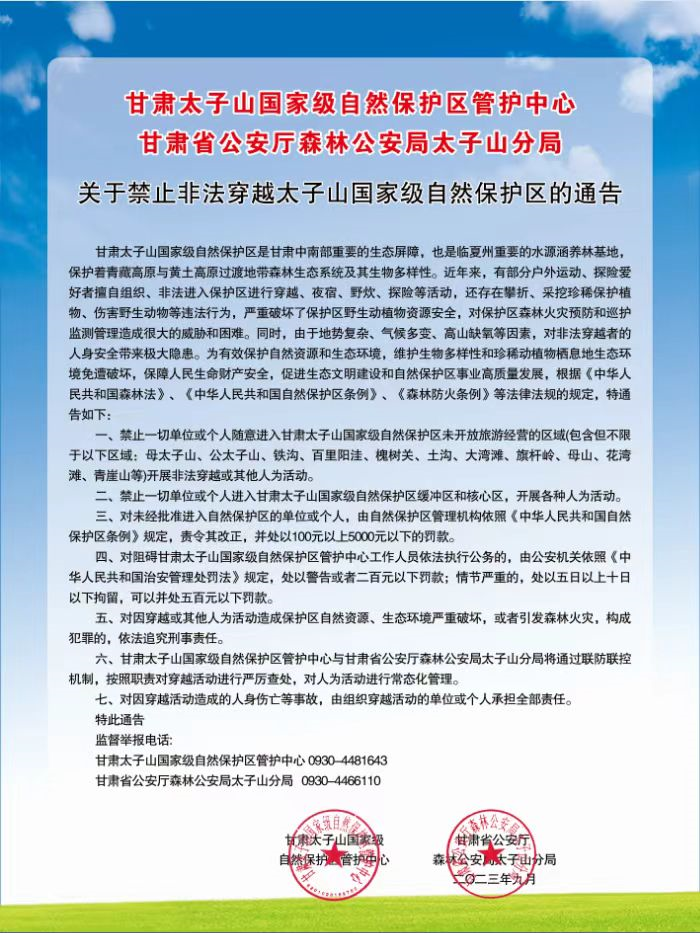 特此通告监督举报电话:甘肃太子山国家级自然保护区管护中心 0930-4481643