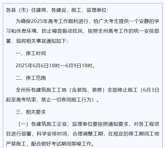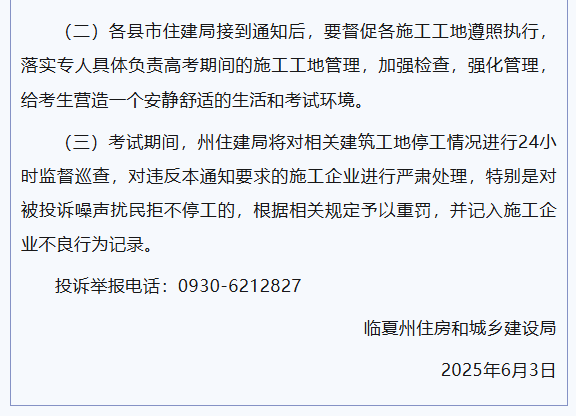 临夏州住房和城乡建设局关于高考期间建筑工地停止施工的通知