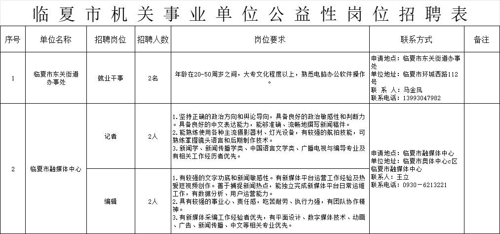 为促进就业困难人员就业,充分发挥公益性岗位托底安置作用,根据州人社局、州财政局《关于印发临夏州公益性岗位开发管理工作实施细则的通知》(临州人社通〔2020〕105号)等有关文件规定及工作需要,现面向社会公开招聘城镇公益性岗位人员。