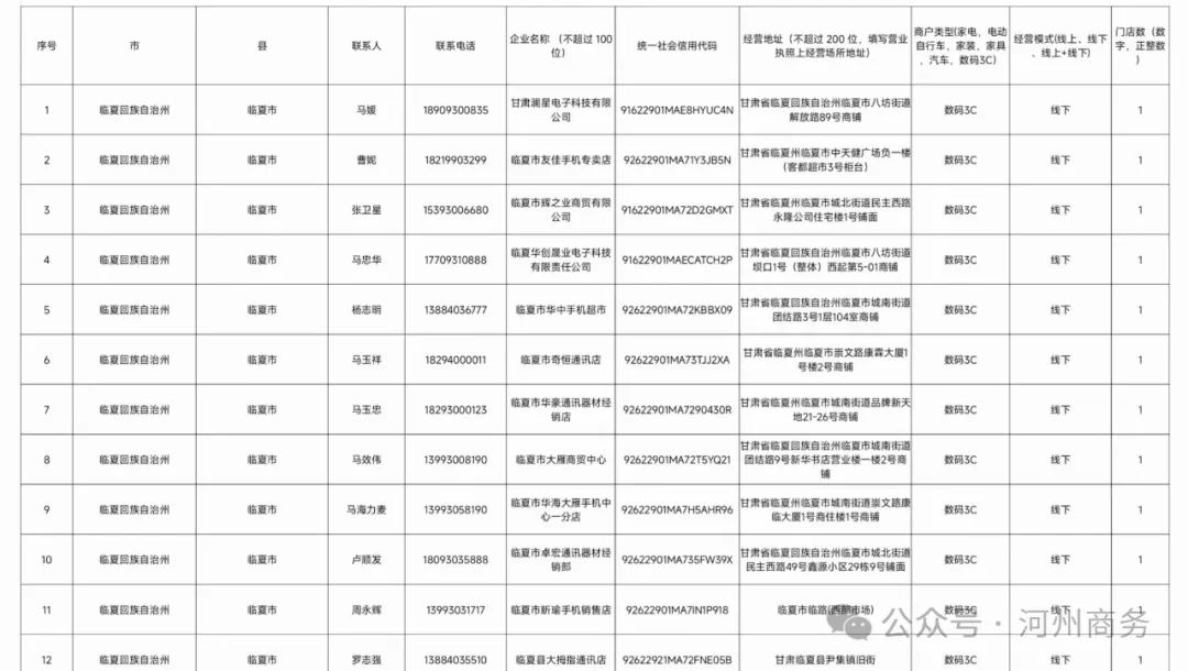按照2025年全省消费品以旧换新工作总体安排,现将临夏市第三批参与实施消费品以旧换新补贴政策的企业名录予以公告。临夏市消费品以旧换新补贴实施3C数码企业名录(第三批)
