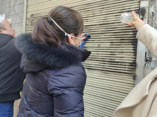 通过环境卫生排查,发现辖区街边墙面出现墙皮掉落、墙面污损等问题,社区了解该情况后,工作人员带领志愿者进行墙体粉刷美化。在粉刷过程中,志愿者们先拿刷子认真清理墙面上的灰尘,再用滚筒蘸着涂料一遍一遍进行粉刷,遇到印有小广告的地方就用工具进行铲除。同时对商铺卷闸门污垢进行了清洗,经过轮番作业,有效地解决了墙面脏污问题,使街面墙面焕然一新。