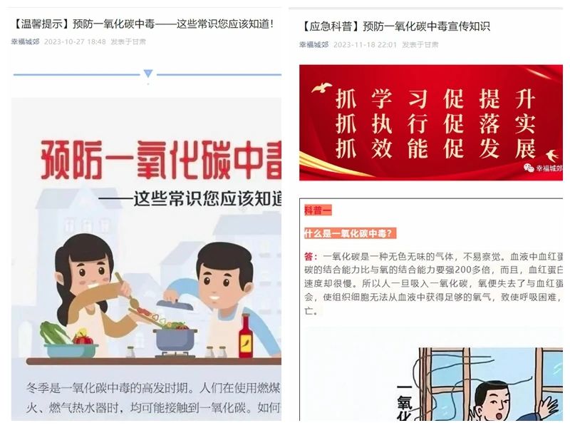 为预防辖区群众一氧化碳中毒事故发生,增强广大群众的安全防范和自我保护意识,提高自救能力。城郊镇立足于防、提前谋划、科学部署,多措并举持续开展防范一氧化碳中毒专项行动,为辖区群众生命安全保驾护航。