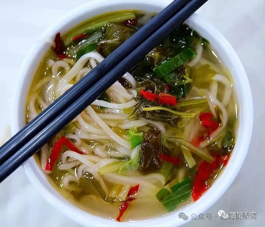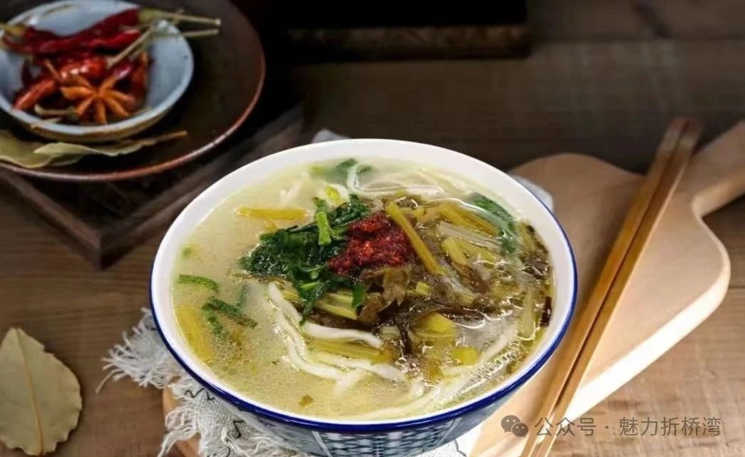 其实,浆水面做法都各有不同,配菜也各有特色,市区街道的饭馆里偶尔也能看到浆水面的牌子,看起来、尝起来也是风格迥异,菜不酸、汤不香、面不细,然而到了折桥湾,餐桌上如果不来一碗浆水面,似乎是说不过去的。