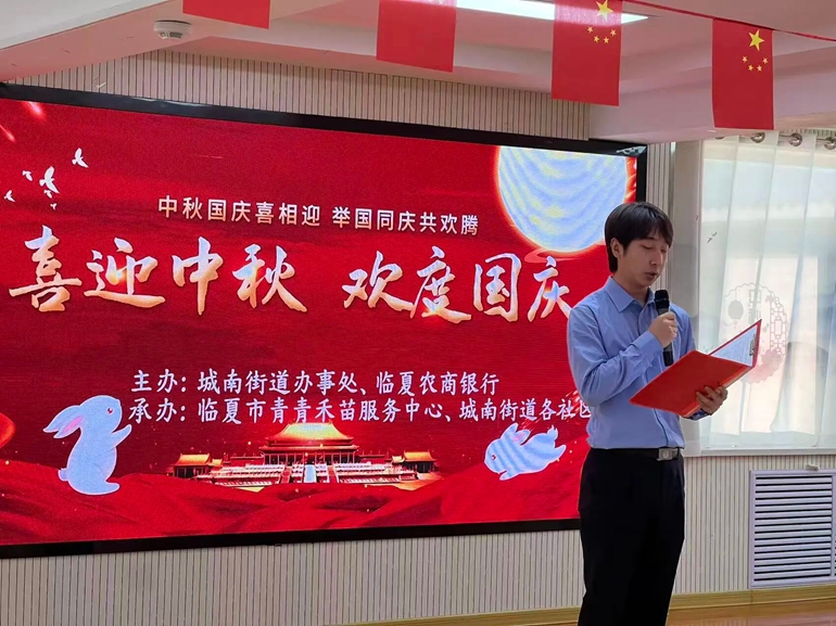 为进一步深化街道与辖区单位的共驻共建机制,丰富辖区群众精神文化生活,9月24日下午,由城南街道、临夏农商银行主办,临夏市青青禾苗服务中心、城南街道民政服务站承办的“庆国庆 迎中秋”主题活动在城南街道风林社区养老幸福驿站开展。本次活动聚焦“一老一小一困”群体的需求,通过“政企联动” 服务模式,让辖区群众在双节前夕便浸润于浓厚的节日氛围与贴心的关怀服务之中。