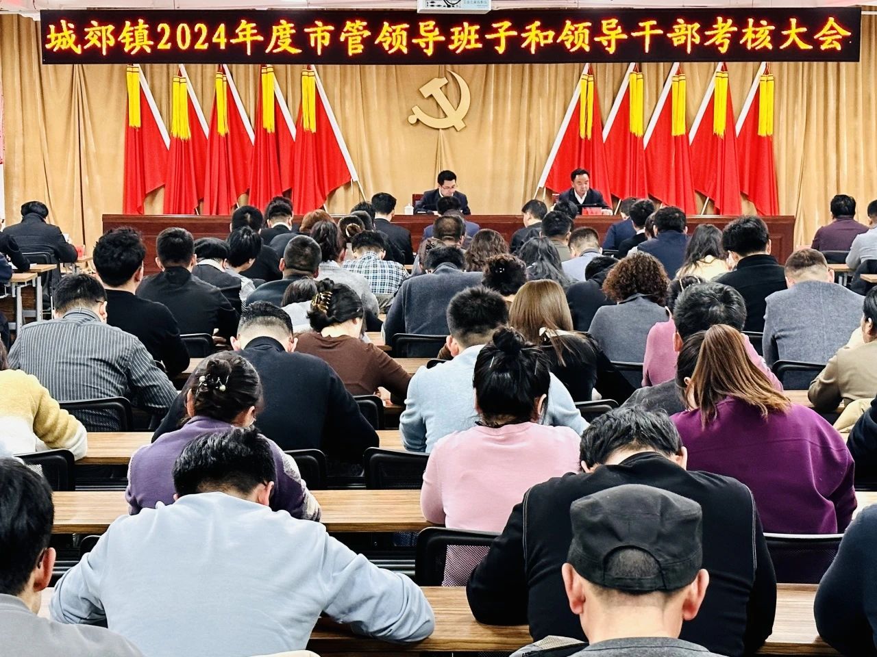 为全面、客观地总结回顾城郊镇2024年度工作,准确掌握干部职工履职尽责情况,充分发挥考核的激励导向作用,有效查摆短板不足,不断激发干部干事创业的积极性与履职担当能力。1月17日上午,市委副书记、组织部部长王进忠带领市委第二考核组对城郊镇2024年度市管领导班子和领导干部工作进行年度考核,镇全体班子成员、镇村干部、各村(社区)书记、副书记和各驻村工作队、“两代表一委员”、群众代表共计120余人参加考核大会。