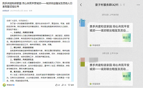 积极宣传,营造氛围。为营造“人人主动登记、人人配合登记”的社会氛围,提升出租房主及承租人安全意识,城郊镇通过公众号、各村(社区)便民服务微信群等方式发布城郊镇出租屋及流动人口主动登记倡议书,向广大群众宣传相关政策、消防安全等相关知识;同时,在摸排过程中,工作人员向租户宣传房屋租赁备案、流动人口权益保障、反诈防骗等政策法规,提升群众法律意识和安全意识。
