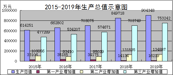 经济增长:初步核算,2019年实现生产总值904348万元,比上年增长6.2%。其中:第一产业增加值16219万元,增长4.1%;第二产业增加值134887万元,下降0.1%;第三产业增加值753242万元,增长7.5%。第三产业中交通运输、仓储和邮政业增加值31707万元,增长3.9%;批发和零售业增加值96174万元,增长7.2%;住宿和餐饮业增加值28884万元,增长5.8%;金融业增加值103302万元,增长11.9%;房地产业增加值50131万元,下降2.1%;营利性服务业增加值87374万元,增长19.6%;非营利性服务业增加值352631万元,增长5.6%。人均生产总值30786元,增长5.5%。