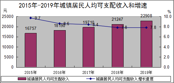人民生活:城镇居民人均可支配收入22908元,净增1661元,增长7.8%。城市居民人均消费支出17769元,净增1014元,增长6.1%。城镇居民恩格尔系数31.2%。