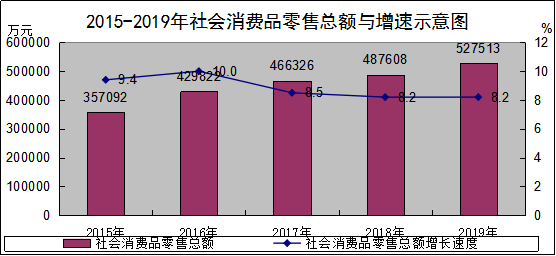 全年完成社会消费品零售总额527513万元,比上年增长8.2%。 按行业分,批发业16339万元,增长7.3%;零售业399508万元,增长7.4%;住宿业8381万元,增长4.4%;餐饮业103286万元,增长11.2%。