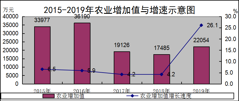 全年实现农业增加值22054万元,比上年增26.1%。其中:种植业4545万元, 增长2.3%;林业44万元,增长117.5%;牧业14275万元,增长42.8%;渔业150万元,增长99.9%;农林牧渔服务业3040万元,增长3.1%。