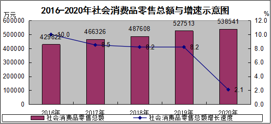 全年完成社会消费品零售总额538541万元,比上年增长2.1%。 按行业分,批发业40847万元,下降11.7%;零售业414747万元,增长1.8%;住宿业11465万元,下降15.7%;餐饮业71481万元,增长18.7%。