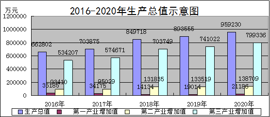 经济增长:初步核算,2020年实现生产总值959230万元,比上年增长5.9%。其中:第一产业增加值21186万元,增长4.2%;第二产业增加值138709万元,增长3.3%;第三产业增加值799336万元,增长6.4%。分季度看,一季度生产总值同比下降1.1%,二季度增长2.9%,三季度增长4.2%,全年增长5.9%。
