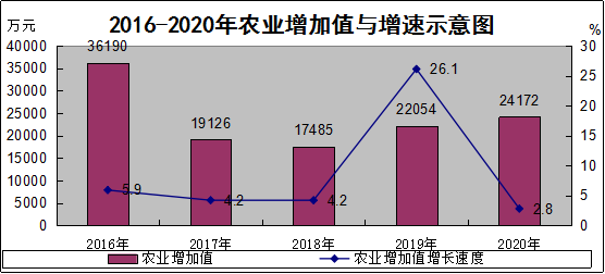 全年实现农业增加值24172万元,比上年增长2.8%。其中:种植业5231万元, 增长6.4%;林业22万元,下降48.4%;牧业15910万元,增长7.2%;渔业21万元,下降85.8%;农林牧渔服务业2986万元,下降2.6%。