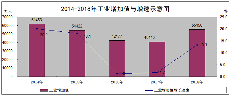 全部工业企业实现增加值55150万元,比上年增长13.3%。其中:规模以上工业企业实现增加值37035万元,比上年增长17.7%。按经济类型分,国有控股企业实现增加值21553万元,下降39.0%;股份制企业实现增加值37035万元,增长17.7%;私营企业完成增加值15125万元,下降4.0%。按轻重工业分,轻工业实现增加值13454万元,下降9.9%;重工业实现增加值23581万元,增长41.4%。