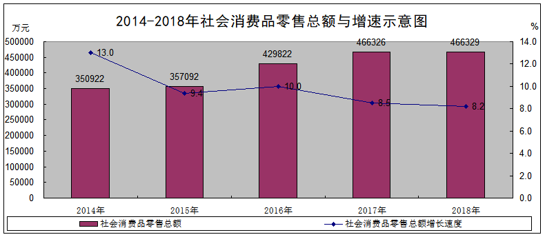 全年完成社会消费品零售总额466329万元,比上年增长8.2%。 按行业分,批发业15225万元,增长9.7%;零售业361955万元,增长8.1%;住宿业7549万元,增长14.6%;餐饮业81601万元,增长7.6%。