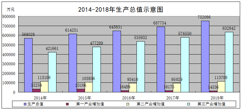 经济增长:初步核算,2018年实现生产总值752086万元,比上年增长5.5%。其中:第一产业增加值14536万元,增长5.1%;第二产业增加值113708万元,增长7.3%;第三产业增加值623842万元,增长5.2%。第三产业中交通运输、仓储和邮政业增加值11880万元,增长4.3%;批发和零售业增加值84319万元,增长2.5%;住宿和餐饮业增加值61564万元,增长4.6%;金融业增加值64159万元,下降0.5%;房地产业增加值30133万元,增长5.4%;营利性服务业增加值134832万元,增长33.4%;非营利性服务业增加值234006万元,下降5.1%。人均生产总值24319元,增长1.3%(2010年不变价)。