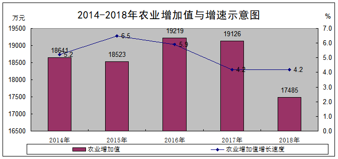 全年实现农业增加值17485万元,比上年增长4.2%。其中:种植业4441万元, 增长5.6%;林业20万元,下降13.6%;牧业10000万元,增长5.7%;渔业75万元,下降2.2%;农林牧渔服务业2949万元,下降1.3%。