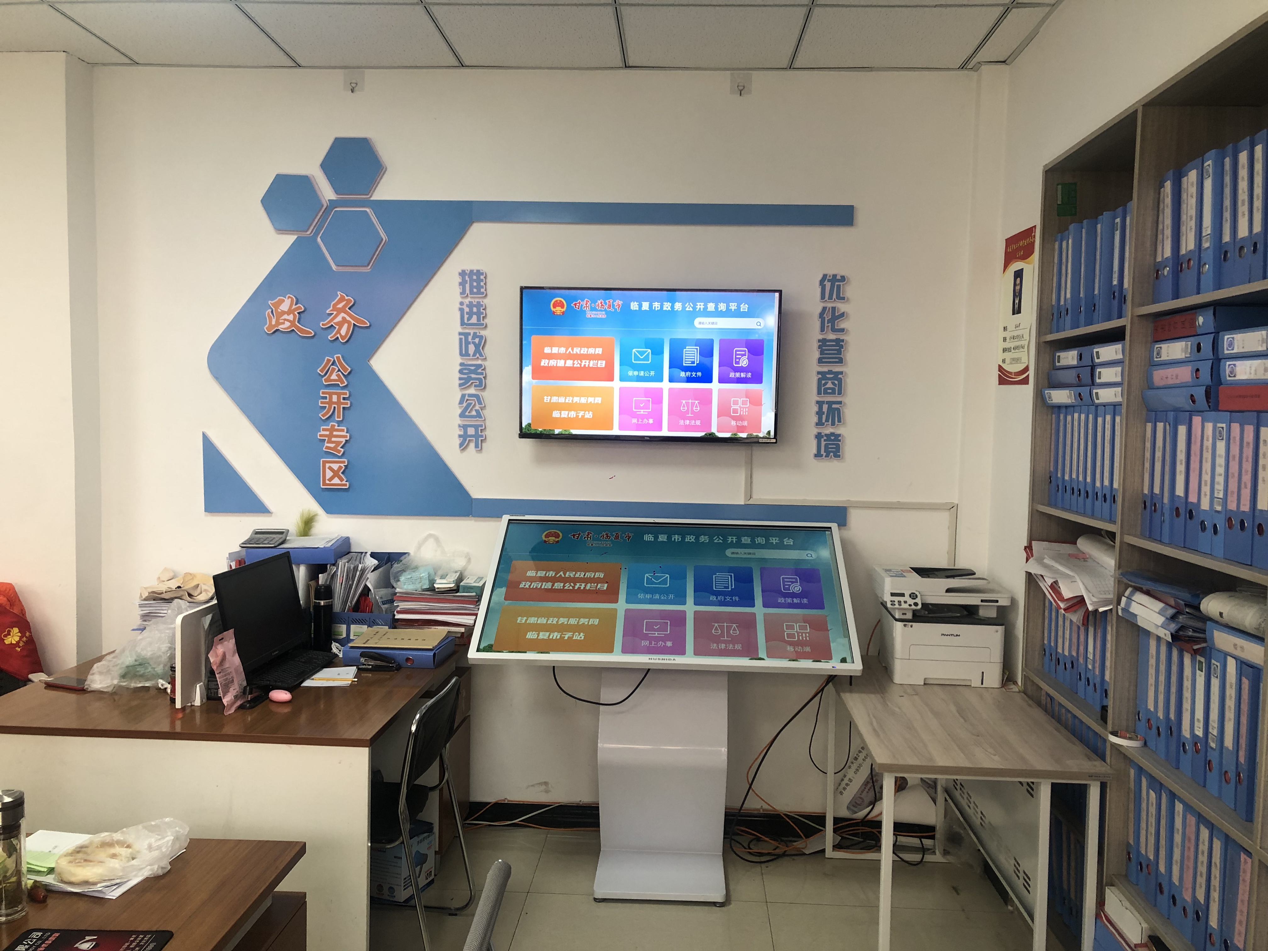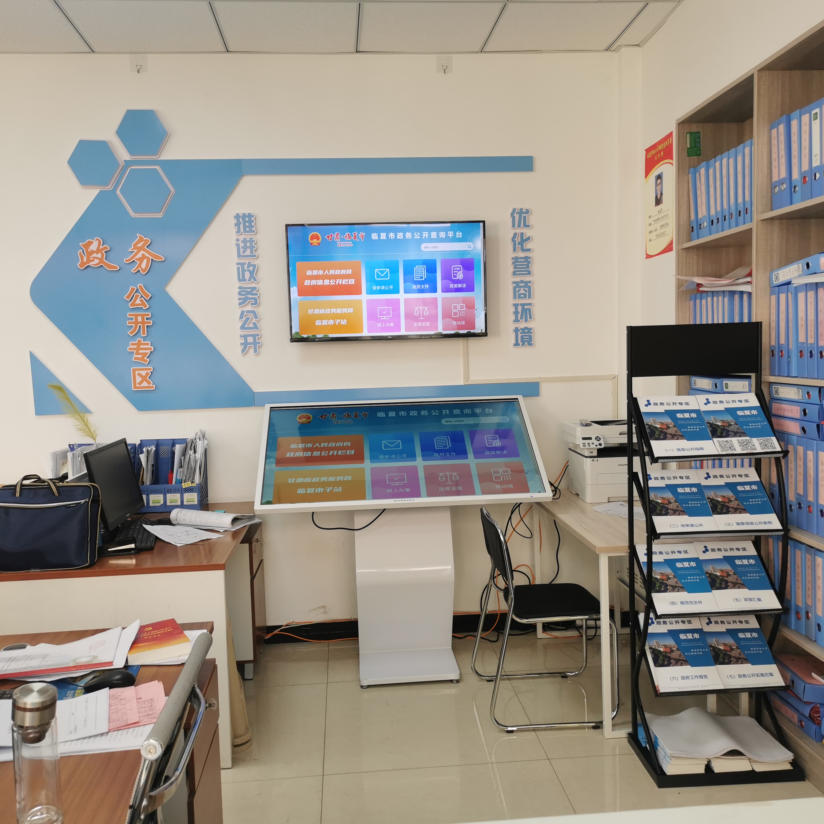 政府信息查询。配备台式电脑、桌椅、政府信息查询一体机、资料展示架等设施设备。资料展示架可展示政府公报、现行规范性文件、政务公开相关政策文件等材料。由我市自主开发的“政务公开查询平台”可查询政府文件、政策解读、办事指南、法律法规等政策信息,同时,可快速查询全市各单位政务新媒体二维码,查询并获取政务相关信息。