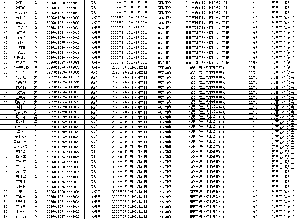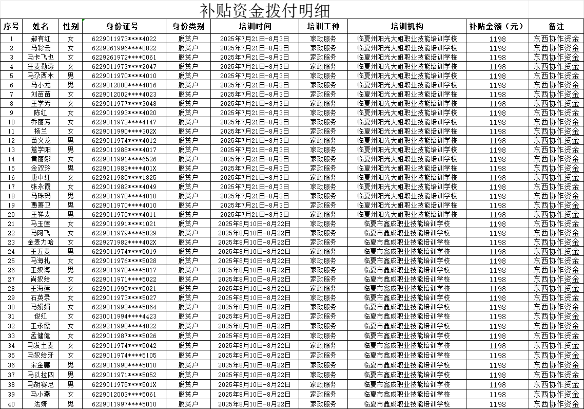 根据中共临夏市委农村工作领导小组办公室《关于印发临夏市2025年东西部协作资金项目计划的通知》(临市农领组发〔2025〕5号)、《关于印发临夏市2025年东西部协作工作方案的通知》(临市农领组发〔2025〕10号)精神,经临夏市人社局审核,拟使用东西协作资金拨付以下培训补贴共100384元:一、拨付临夏市鑫成职业技能培训学校临夏市2025年东西部协作劳务技能培训--枹罕镇家政服务培训补贴39534元,培训合格33人,人均补贴1198元;二、拨付临夏州阳光大姐职业技能培训学校临夏市2025年东西部协作劳务技能培训--折桥镇家政服务培训补贴23960元,培训合格20人,人均补贴1198元;三、拨付临夏市职教中心临夏市2025年东西部协作劳务技能培训--南龙镇中式面点培训补贴36890元,培训合格31人,人均补贴1190元。现对培训合格人数及资金使用情况进行公示接受社会监督。如发现有影响公示项目拨付的问题,可通过电话、来信、面谈等形式反映,我们将认真进行受理。如不存在影响拨付的问题,将按有关规定及程序予以拨付。