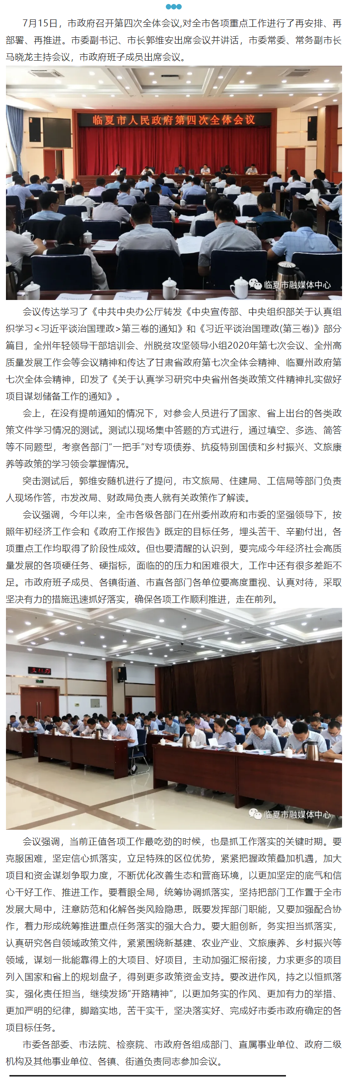 2月4日,临夏市第十七届人民政府第四次全体会议召开,学习贯彻省州“两会”和省政府、州政府全体会议精神,分解落实省州市《政府工作报告》主要指标任务,安排部署重点工作。市委副书记、市长刘尚增出席会议并讲话,市委常委、常务副市长陈占奎主持会议,市政府班子成员参加会议。