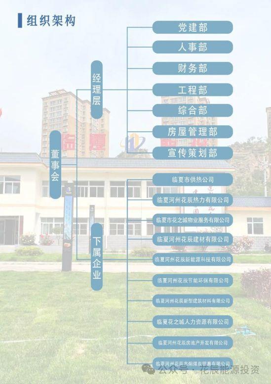 临夏河州花辰能源投资管理(集团)有限公司成立于2022年12月2日,是临夏市人民政府授权的国有独资公司,依据临夏市人民政府、临夏市财政局监管依法开展经营活动。公司着力打造以供暖服务、房地产、物业服务、综合能源、热力生产和供应、新能源、煤改电、储能技术服务节能管理服务,建筑材料销售为核心的业态多元、产业协同、要素共享的综合能源服务企业。集团下设人事部、党建部、宣传策划部、财务部、工程部、房屋管理部、综合部等七个部门。现公司基本架构已按企业规章制度完善成形,业务布局涉及多个行业和领域,花辰集团下设十个子公司,分别为临夏市供热公司、临夏河州花辰热力有限公司、临夏市花之城物业服务有限公司、临夏河州花辰建材有限公司、临夏河州花辰新能源科技有限公司、临夏河州花辰节能环保有限公司、临夏河州花辰新型建筑材料有限公司、临夏花之城人力资源有限公司、临夏河州花辰房地产开发有限公司、临夏河州花辰志烔煤炭贸易有限公司,涉及业务包括供热、物业、节能建筑、新能源、绿色建材、房地产开发等行业。2023年底,集团总计就业人员402人。