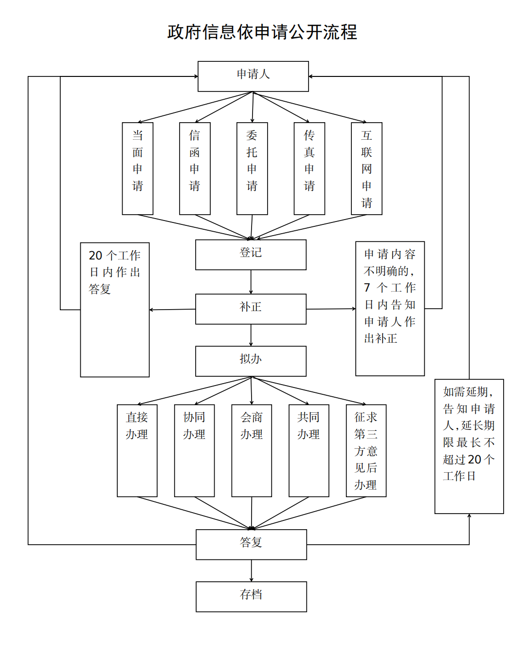 1.答复的期限。受理机构收到政府信息公开申请,能够当场答复的,将当场予以答复;不能当场答复的,将于收到申请之日起20个工作日内予以答复;需要延长答复期限的,将按程序报经政府信息公开工作机构负责人同意并告知申请人,延长的期限最长不超过20个工作日。受理机构征求第三方和其他机关意见所需时间不计算在上述期限内。