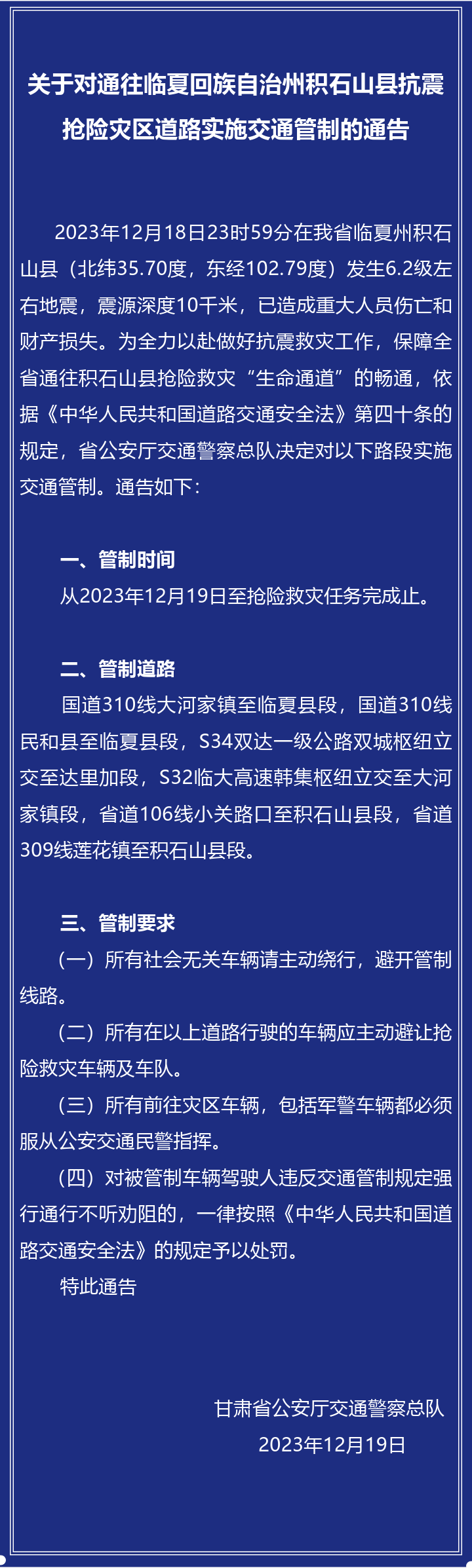 关于对通往临夏回族自治州积石山县抗震抢险灾区道路实施交通管制的通告