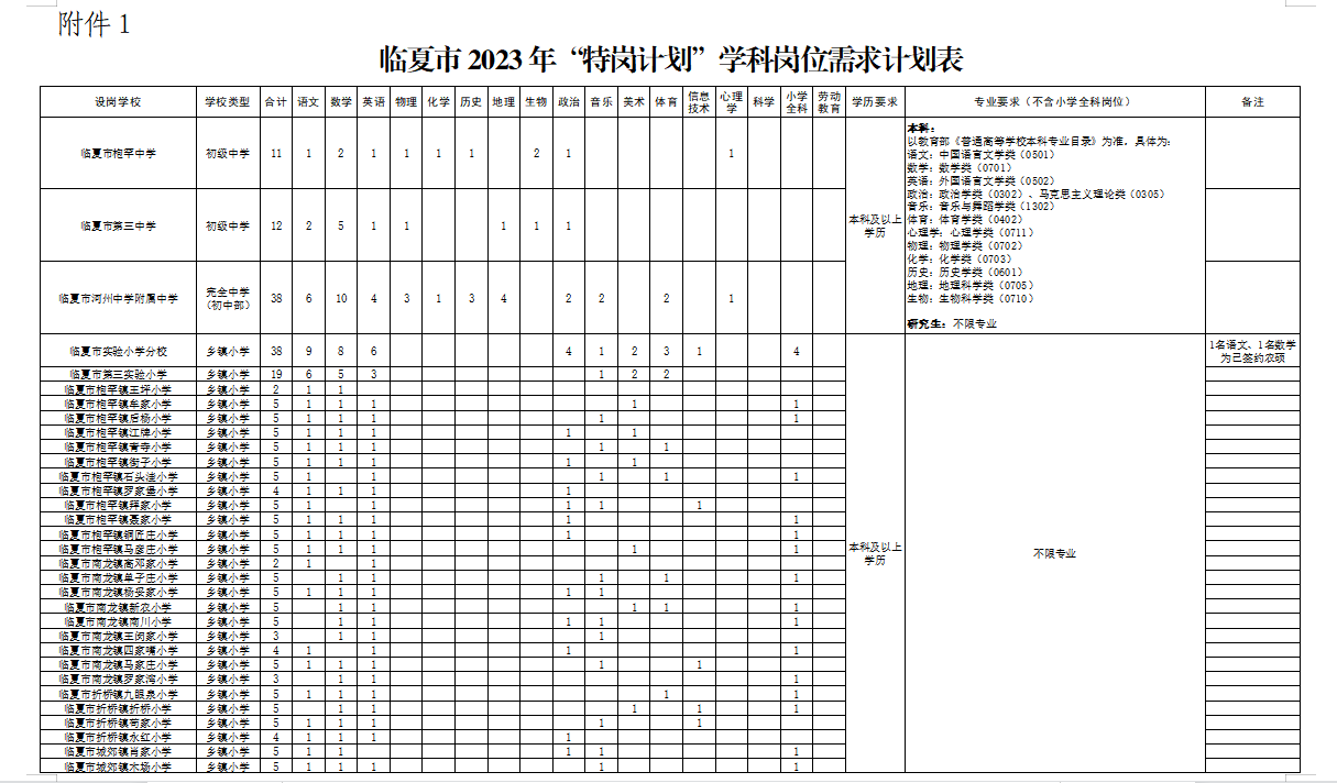 1.临夏市2023年“特岗计划”学科岗位需求计划表