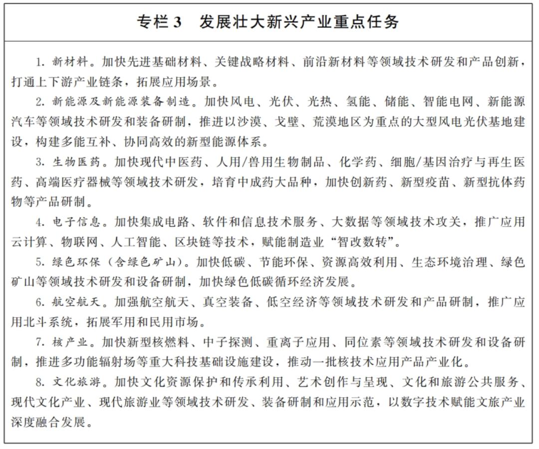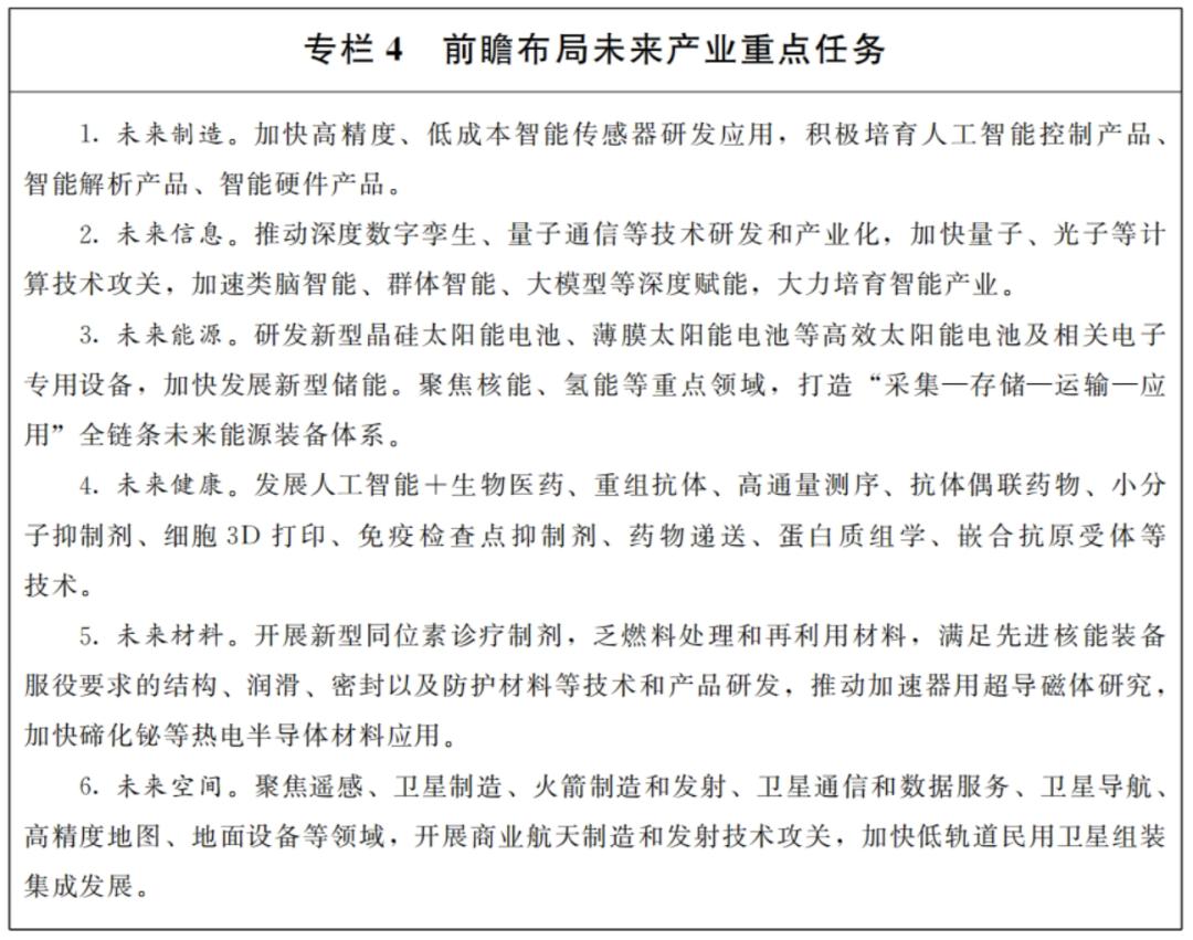 6.前瞻布局未来产业。瞄准国家战略需求、未来产业发展趋势,前瞻部署一批战略性、储备性技术研发项目,统筹做好原创技术、底层技术攻关和产业标准研制,推动绿色氢能、新型储能、核技术、量子科技、商业航天等前沿技术应用及产业化发展。(责任单位:省工信厅、省发展改革委、省科技厅、省委军民融合办、省能源局、省政府国资委)
