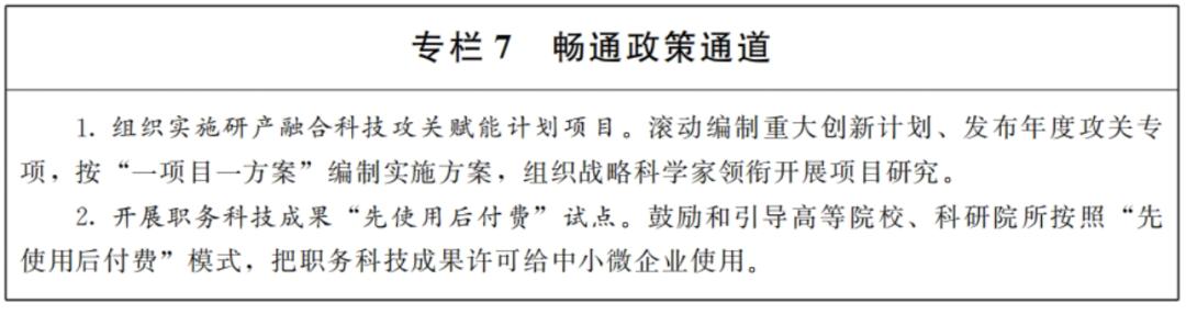 18.创新重大技术攻关和转化“一体化”组织形式。进一步优化省级科技计划组织形式,健全完善企业“出题”、政府“选题”、联合“答题”、市场“判题”攻关组织机制,成熟一项、启动一项,实施研产融合科技攻关赋能计划专项。建立重大攻关任务行政和技术“两总系统”指挥体系,实行技术指标和经济指标“双目标”考核机制,一体化推进关键技术攻关和重大成果产业化应用。2025年,实施研产融合科技攻关赋能计划项目10项左右。(责任单位:省科技厅、省工信厅、省财政厅、省政府国资委)