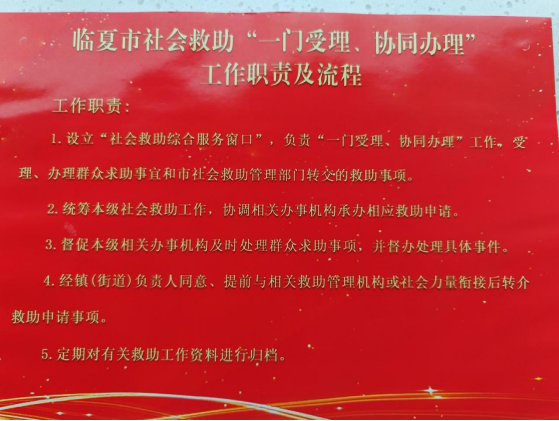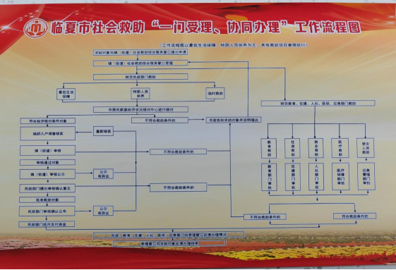 根据甘肃省民政厅《关于加快推进一门受理协同办理机制建设的通知》和《临夏市社会救助一门受理协同办理工作实施方案》等相关文件精神,临夏市民政局严格落实“一门受理、协同办理”机制,在街道便民服务中心设立“社会救助综合服务窗口”,充分发挥“窗口”作用,积极建立化解困难群众急难问题的“绿色通道”,实行首问责任制,统一受理最低生活保障、特困人员供养、住房救助、自然灾害救助、医疗救助、临时救助以及其他救助申请,辖区困难群众提出救助申请后,街道及时受理、分类登记,并按救助权限向相关职能部门转办,确保困难群众“求助有门、受助及时”。