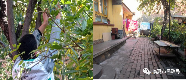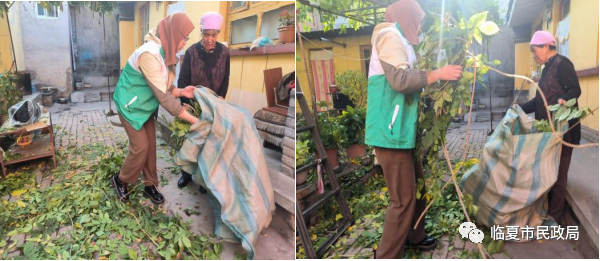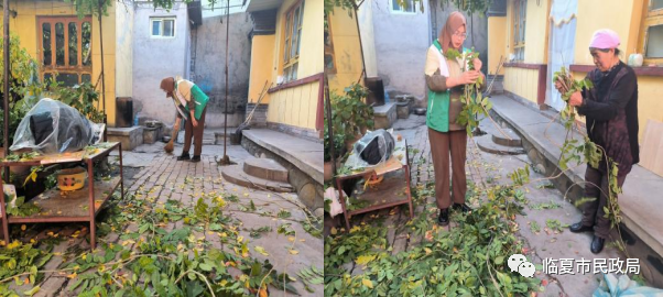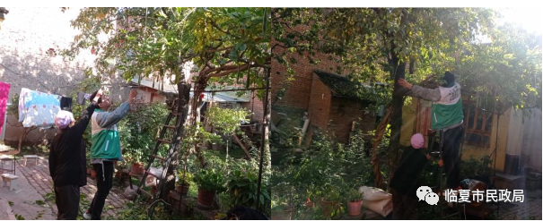 社工为困难老人们送上冬天保暖的衣物后,马不停蹄地帮忙修剪树枝、打扫院子,让受助老人感动不已。