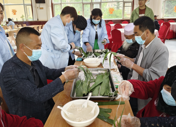 活动伊始,院负责人热情洋溢的端午祝福为现场注入了温暖基调。随后,包粽子环节成为全场焦点。工作人员与供养人员围坐长桌,只见碧绿粽叶在指尖灵巧翻转,雪白糯米在掌心有序传递,粽叶清香与糯米甜香交织弥漫。大家边学边练、互授技巧,欢声笑语中,形态各异的粽子相继成型。这些满载心意的粽子,不仅包裹着红枣、豆沙的香甜馅料,更凝聚着不同民族同胞间互帮互助的深厚情谊。