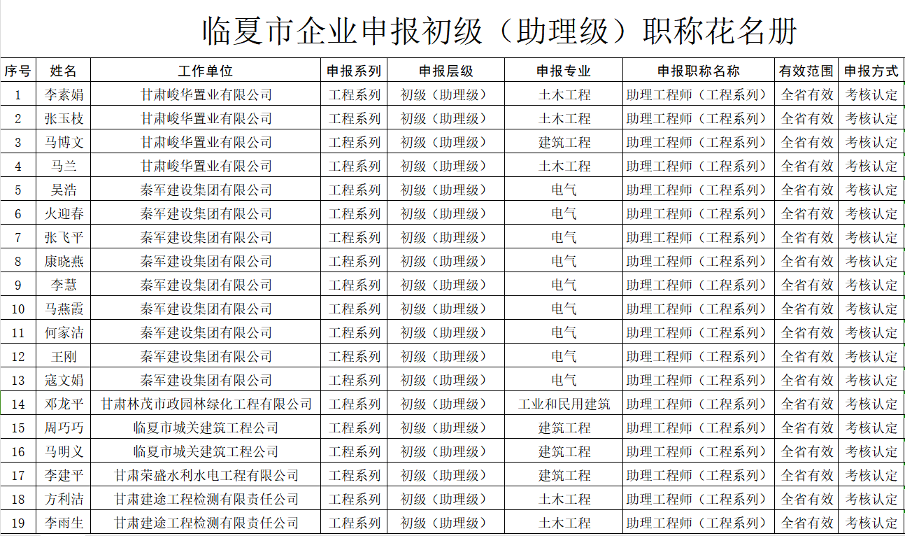 2024年度临夏市企业申报初级(助理级)职称评审拟通过人员由市住建局初审,市人社局审核,拟通过李素娟等19名人员具备初级(助理级)任职资格,现予以公示,接受广大干部群众的监督。