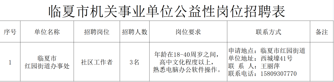 为促进就业困难人员就业,充分发挥公益性岗位托底安置作用,根据州人社局、州财政局《关于印发临夏州公益性岗位开发管理工作实施细则的通知》(临州人社通〔2020〕105号)等有关文件规定及工作需要,现面向社会公开招聘城镇公益性岗位人员。