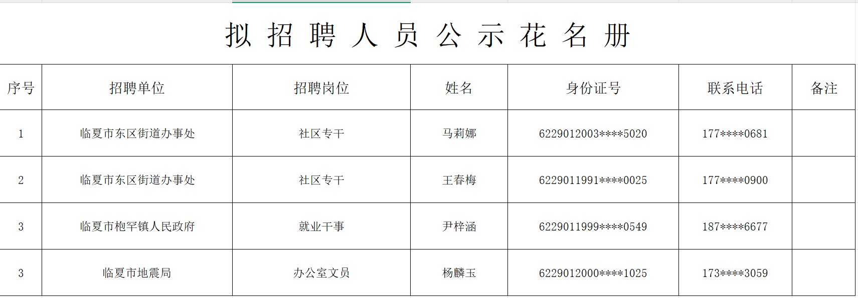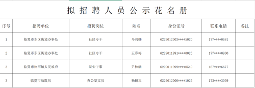 根据《关于进一步加强城镇公益性岗位管理工作的通知》临市人社发〔2022〕56号文件规定,通过发布招聘公告、个人申请、人社部门审核等环节,临夏市东区街道办事处、临夏市枹罕镇人民政府、临夏市地震局确定了以下拟招聘人员,现进行社会公示,公示期内如有异议,请在公示期内到人社部门进行反映。