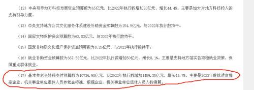 如图,原文说到:基本养老金转移支付预算数为10736.98亿元,比2022年执行数增加1459.35亿元,增长15.7%。主要是2023年继续适度提高企业、机关事业单位退休人员养老金标准,根据企业、机关事业单位退休人员人数测算。