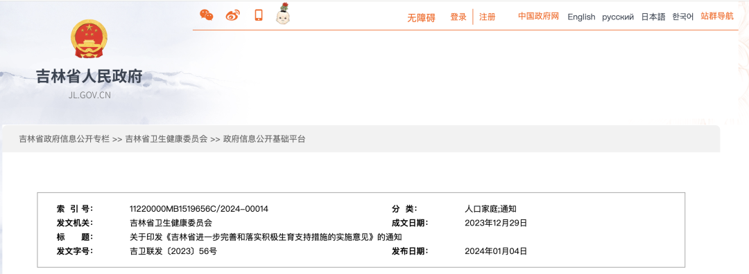 1月4日,吉林省人民政府印布了《吉林省进一步完善和落实积极生育支持措施的实施意见》。