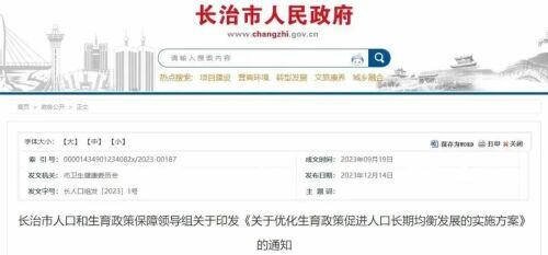 近日,山西省长治市人口和生育政策保障领导组发布关于印发《关于优化生育政策促进人口长期均衡发展的实施方案》的通知。