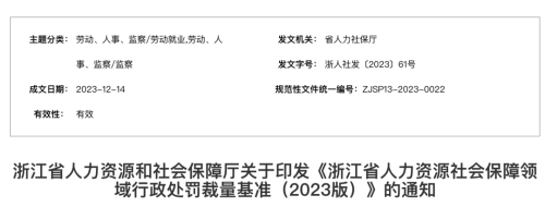 2024年1月1日起,由浙江省人社厅发布的《浙江省人力资源社会保障领域行政处罚裁量基准(2023版)》正式生效。