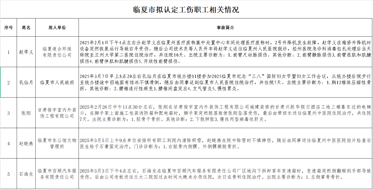 根据《工伤保险条例》有关规定,现将赵学义、孔仙月、张刚、赵晓燕、石海龙认定为工伤相关情况予以公示,接受社会各界监督并对失实情况进行实名举报。举报内容应真实,受理部门对举报人信息严格保密。对举报内容经查证属实的,将严格按照有关规定追究相关责任人的责任。如不存在问题,将按有关程序认定工伤及不予认定工伤。