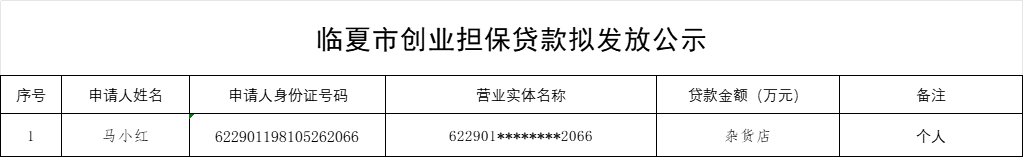 | 标 题 | 临夏市创业担保贷款拟发放人员的公示 | ||